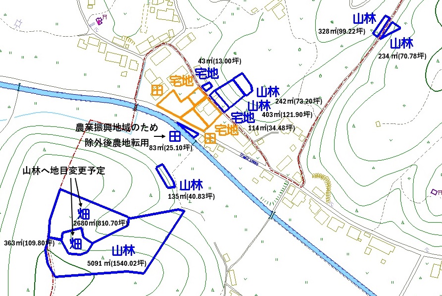 他、宅地2筆157㎡(47.49坪)、畑2筆3043㎡(920.50坪)(山林に地目変更予定)、山林6筆6433㎡(1945.98坪)、田1筆83㎡(25.10坪)(農業振興地域ため、除外後農地転用)が付きます。
