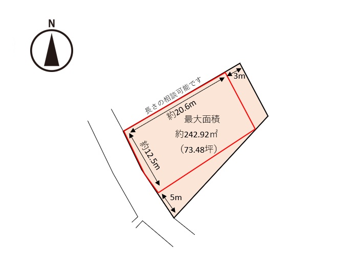 特記事項 本物件は公簿面積334㎡の一部を分筆しての売買です。最大面積は約242.92㎡(73.48坪)となり、この面積以下で面積の相談可能です。